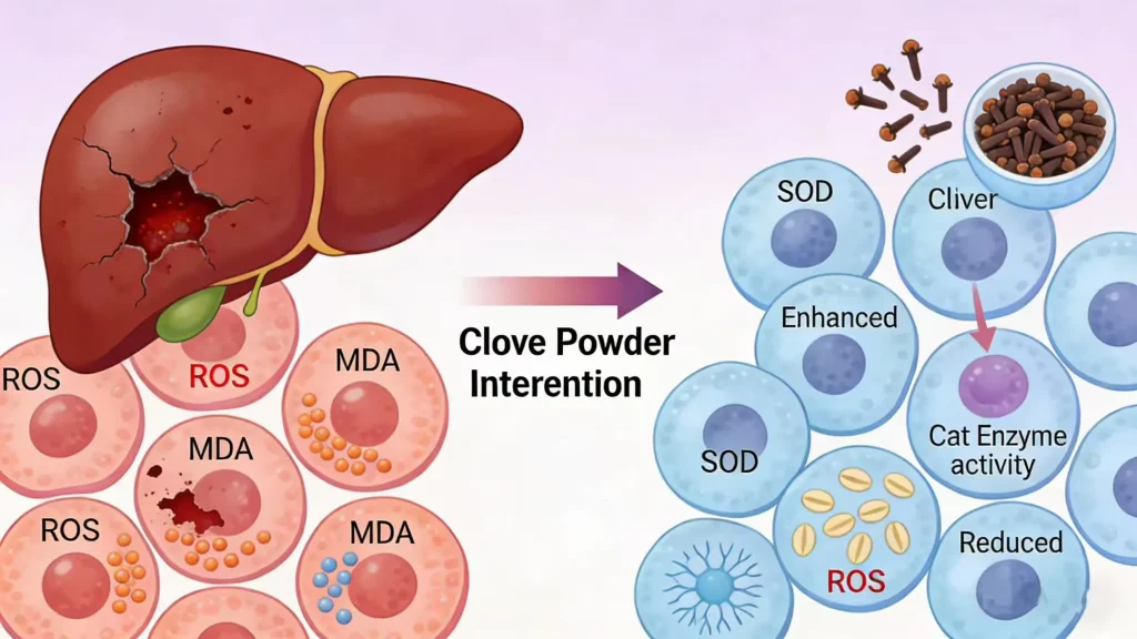 Oxidative stress is the leading cause of liver damage in animals, triggered by factors like poor diet, stress, and toxin exposure. Clove Powder’s eugenol and flavonoids scavenge ROS, reduce MDA production, and boost antioxidant enzyme activity— creating a protective barrier against oxidative damage. In albino rat studies, daily supplementation with Clove Powder reduced liver oxidative stress by 30-40%, preventing lipid peroxidation and preserving liver cell integrity.
