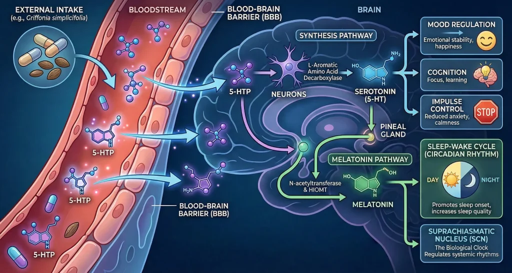 Once Serotonin levels are optimized during the day, the brain can more efficiently convert that Serotonin into Melatonin at night. This dual-action mechanism is why Griffonia Seed Extract is considered a foundational supplement for both emotional stability and circadian rhythm regulation.